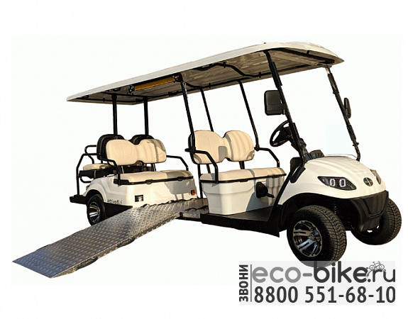 Гольф-кар ATTIVA 8L.6 HC 48V AC - это специализированный 8-местный транспорт с двумя пассажирскими местами для людей с инвалидными колясками. Модернизированная модель 6-местного пассажирского гольф-кара оснащена пандусом. Маневренный и отлично управляемый агрегат справляется с разворотами радиусом 5,1 м. Свинцово-кислотная батарея 8 x 6V, US2200 держит заряд до 80 км и заряжается не более 8 часов. За счет клиренса 21 см, качественной подвески и прочных колес в 10 дюймов гольф-кар справляется с неровностями дороги и кочками, а также способен преодолевать вертикальный подъем в гору до 25%.
